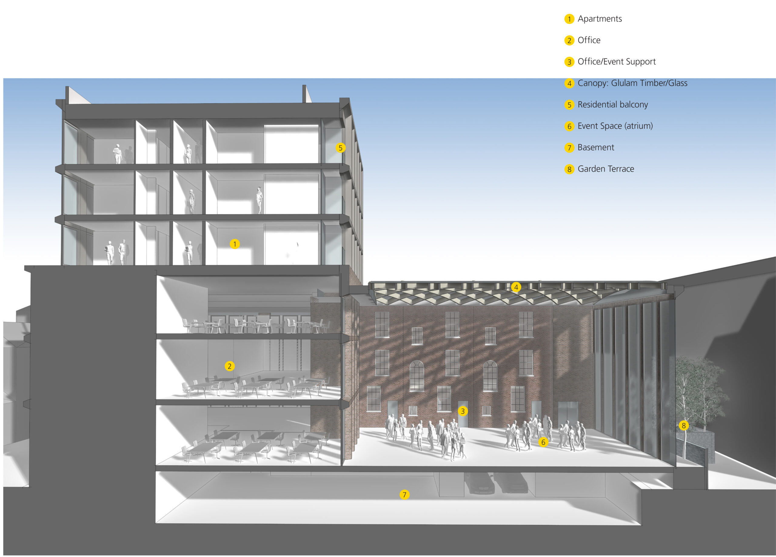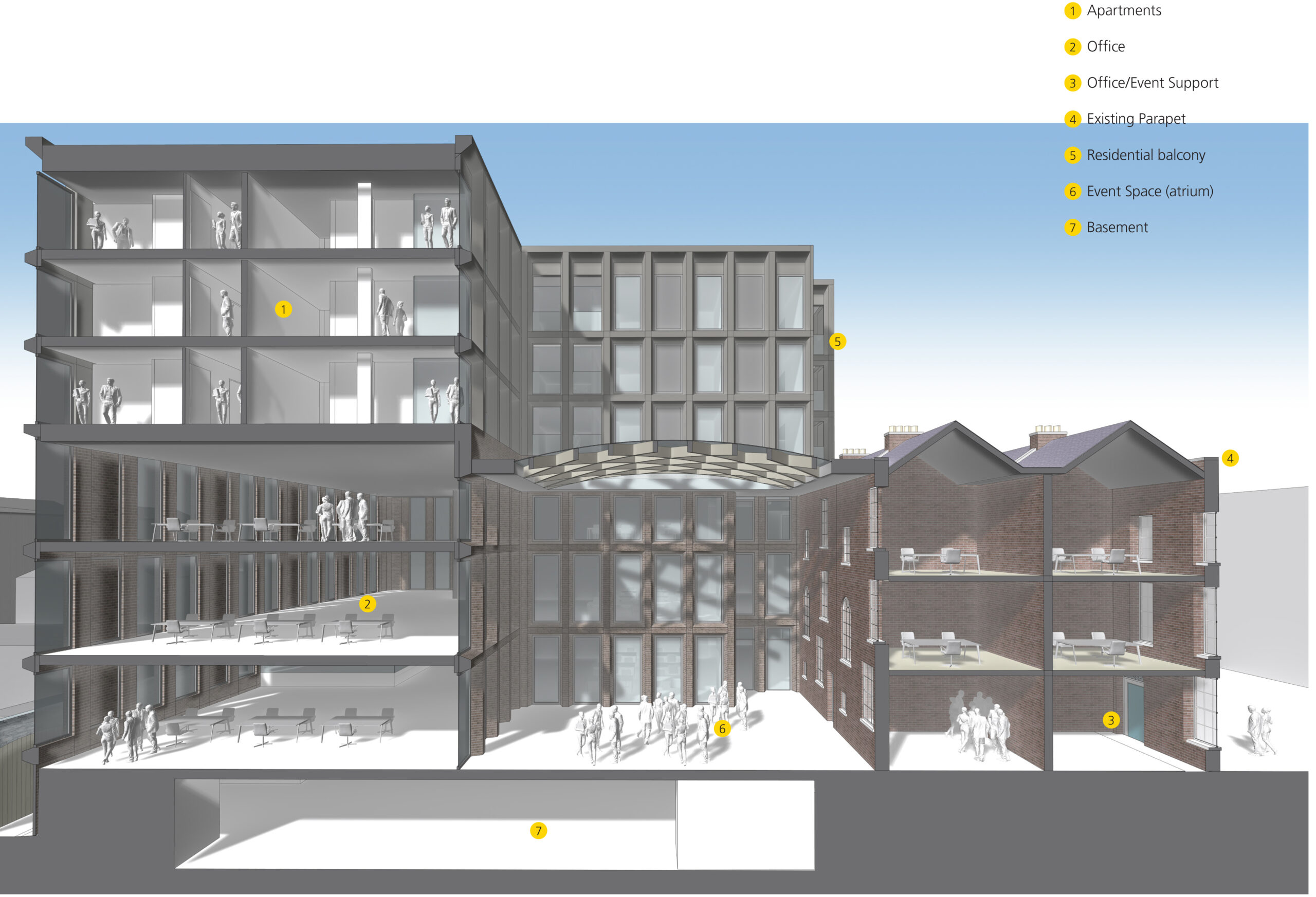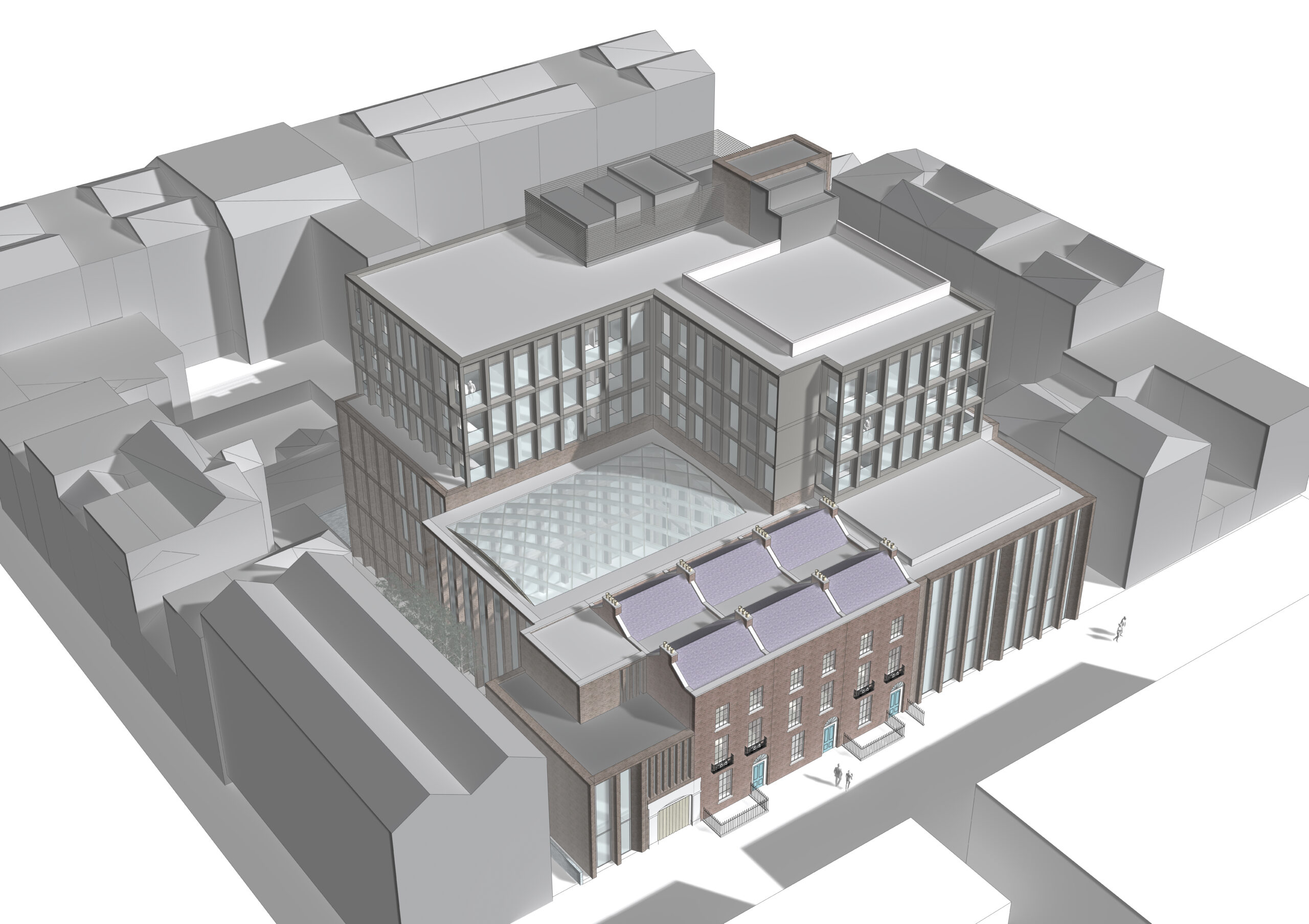 A contemporary volume is introduced to the rear of the terraces, arranged around a new courtyard and centred on an internal atrium that functions as a shared social and event space for office tenants and visitors. Access to the atrium is provided through a retained stone archway, establishing an independent entrance sequence and strengthening the dialogue between historic fabric and new construction.