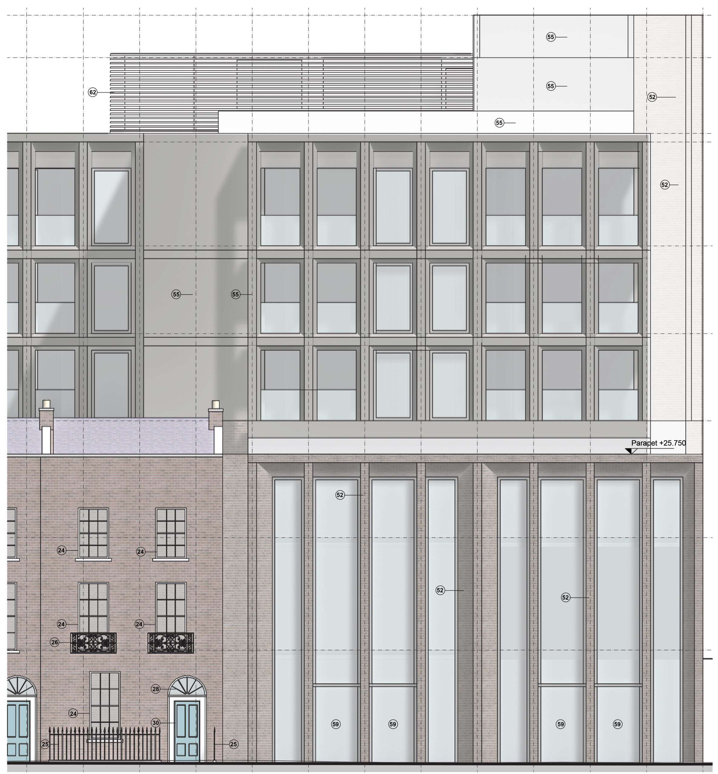 MOLA Architecture was appointed to secure planning permission for a mixed-use office and residential development on Catherine Street in the heart of Limerick’s Georgian Quarter. The site sits within a vibrant and historically layered urban context and the design is anchored around the renovation and adaptive reuse of three Georgian terrace houses that form the architectural frontage to Catherine Street.