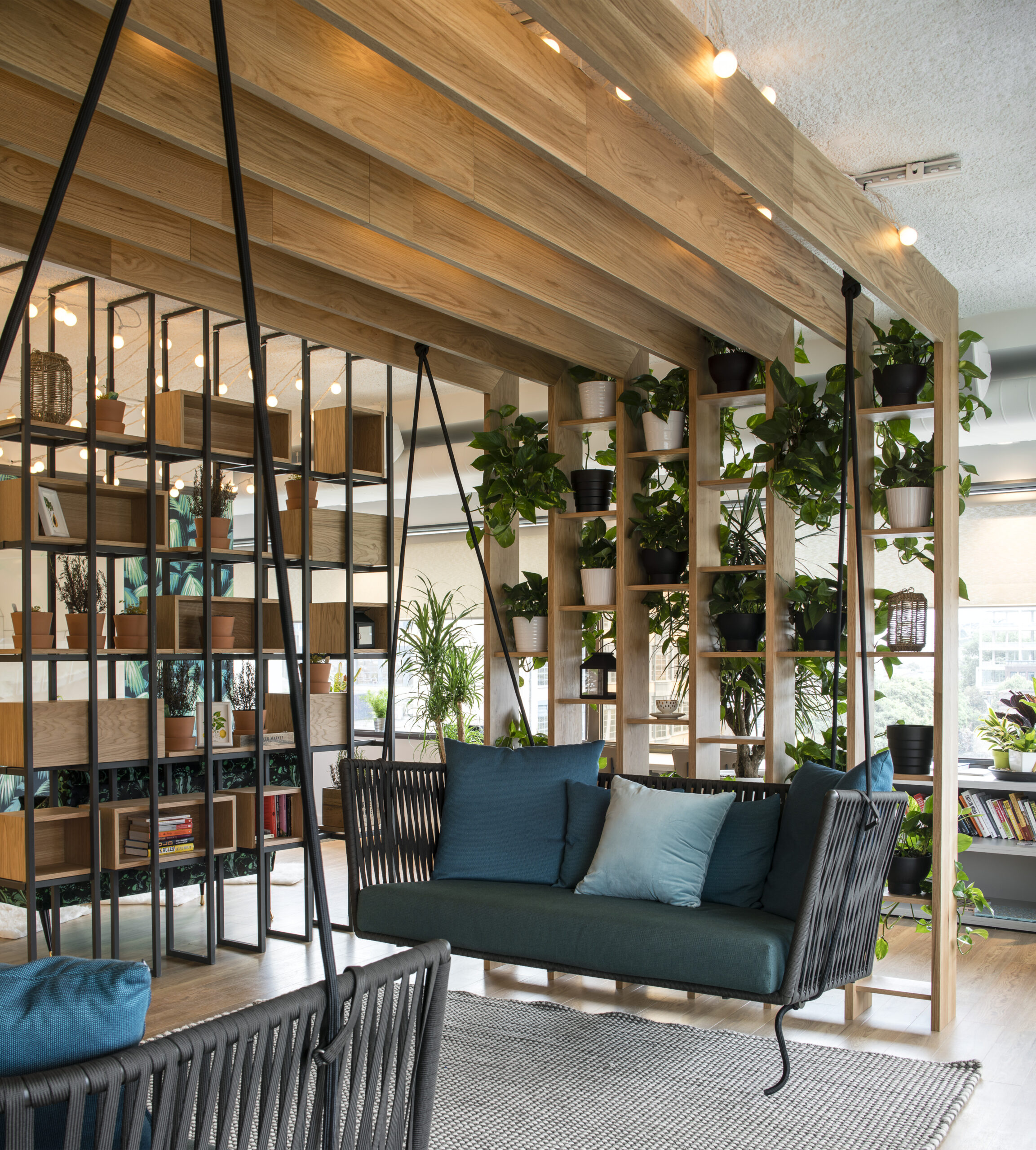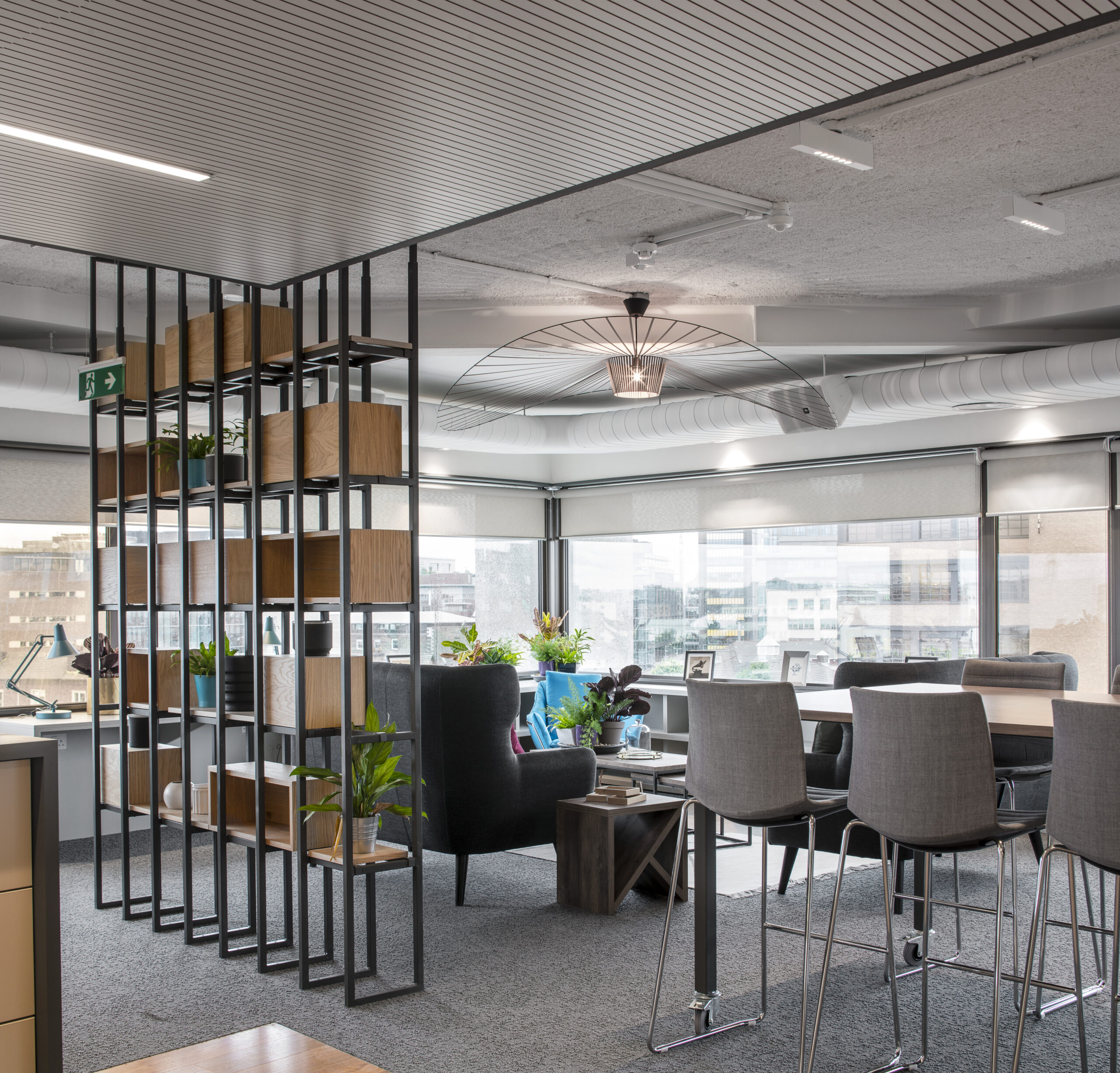 The arrival experience is redefined through a softer, more informal reception, drawing on residential cues to create a welcoming and human-centred environment. Natural materials, layered lighting and integrated planting introduce warmth and texture, establishing a distinct sense of identity. Elsewhere, a series of tailored interventions support a variety of working modes, including a dedicated library and quiet workspace with bespoke shelving and integrated seating. A reimagined café, inspired by Stripe’s San Francisco roots, provides a social anchor within the office.
