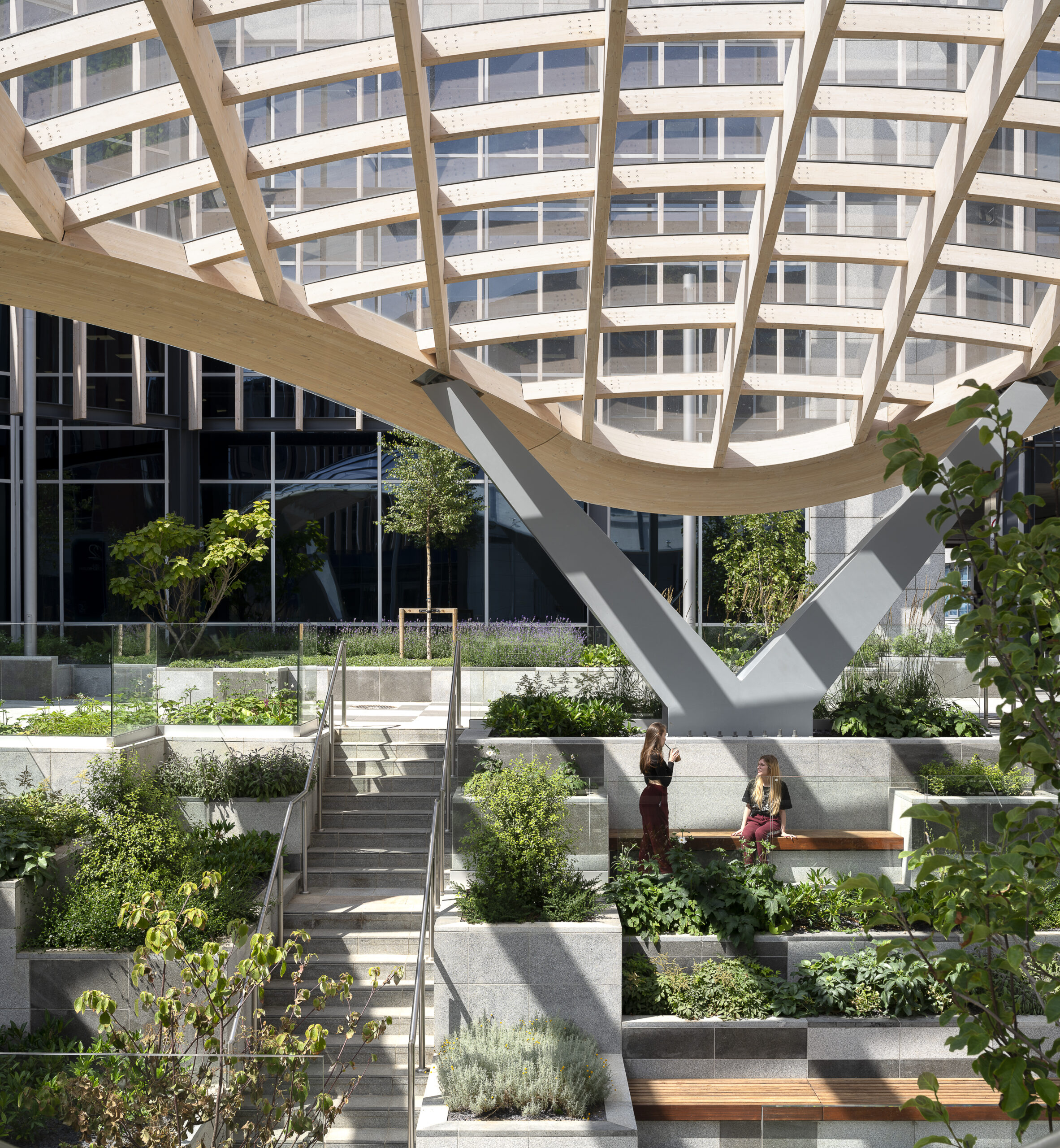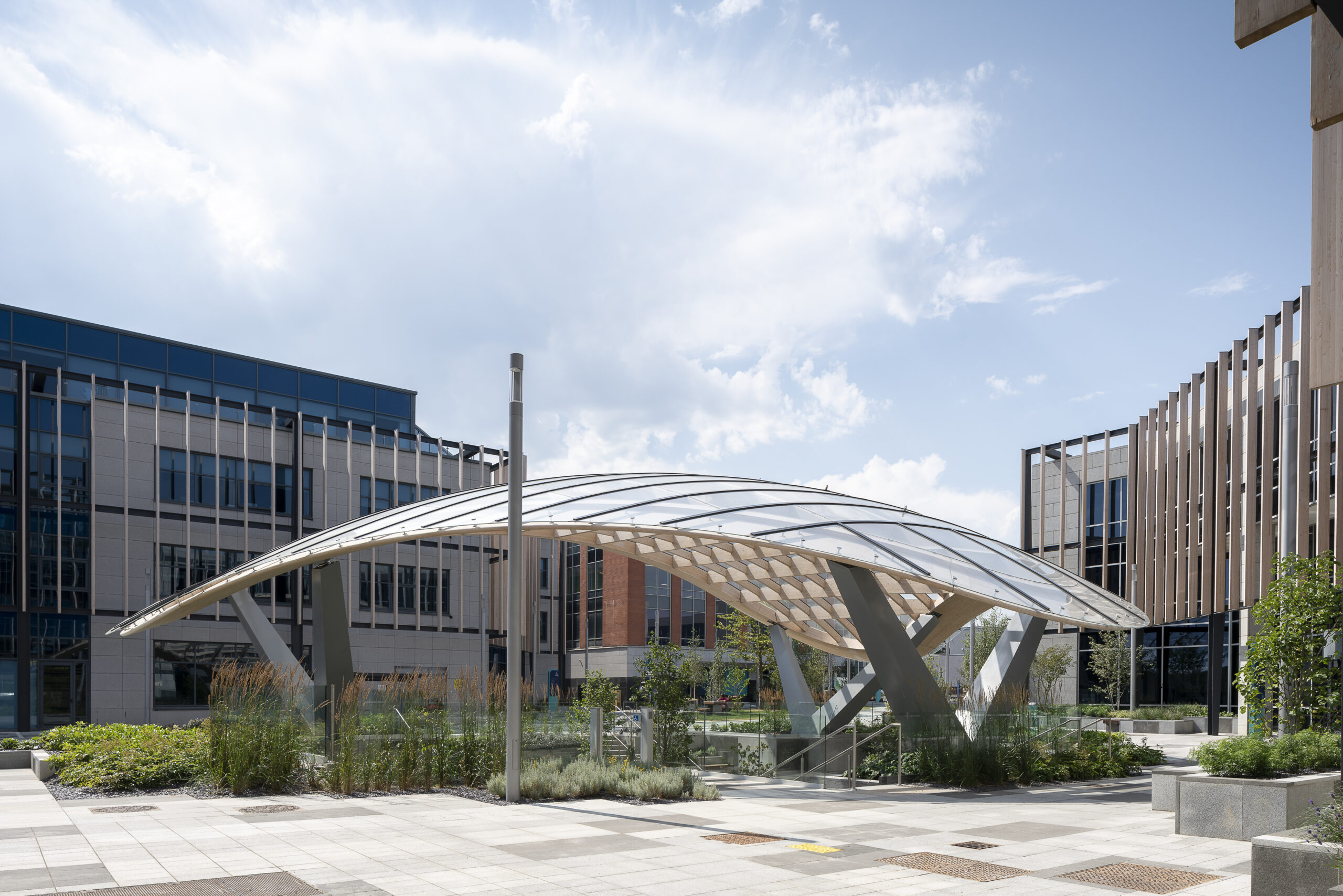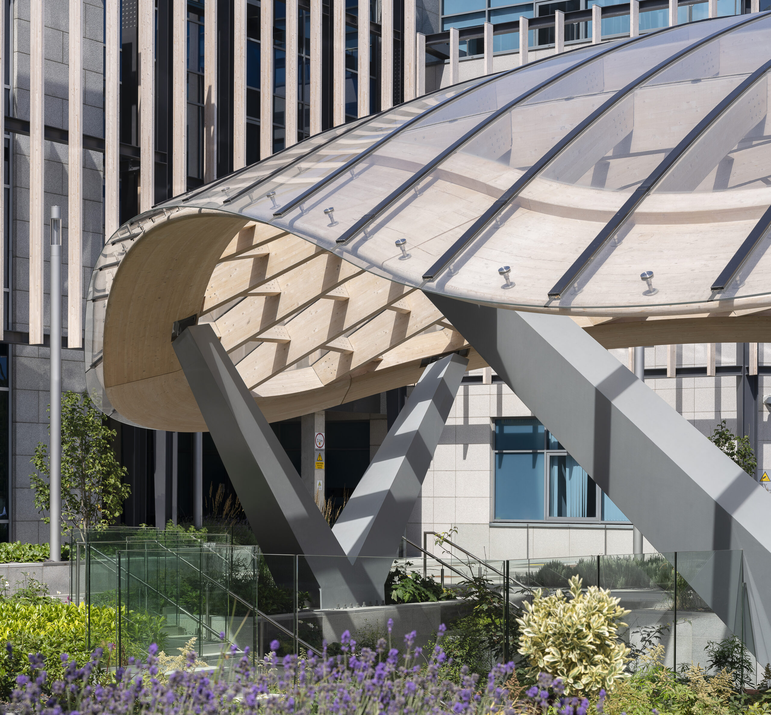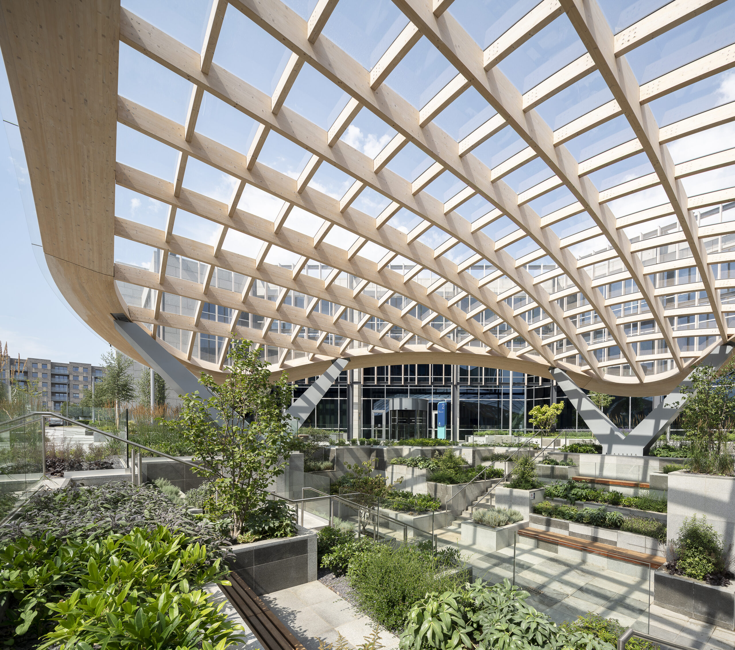 The architectural expression is defined by a series of double-curved glulam timber beams that trace the canopy’s sinuous form. These elements were digitally modelled and CNC-fabricated, with cold-formed glass providing shelter while keeping the structure visibly legible. Rainwater is guided through planted beds in a cascading sequence, creating a self-watering landscape that reinforces the biophilic intent.