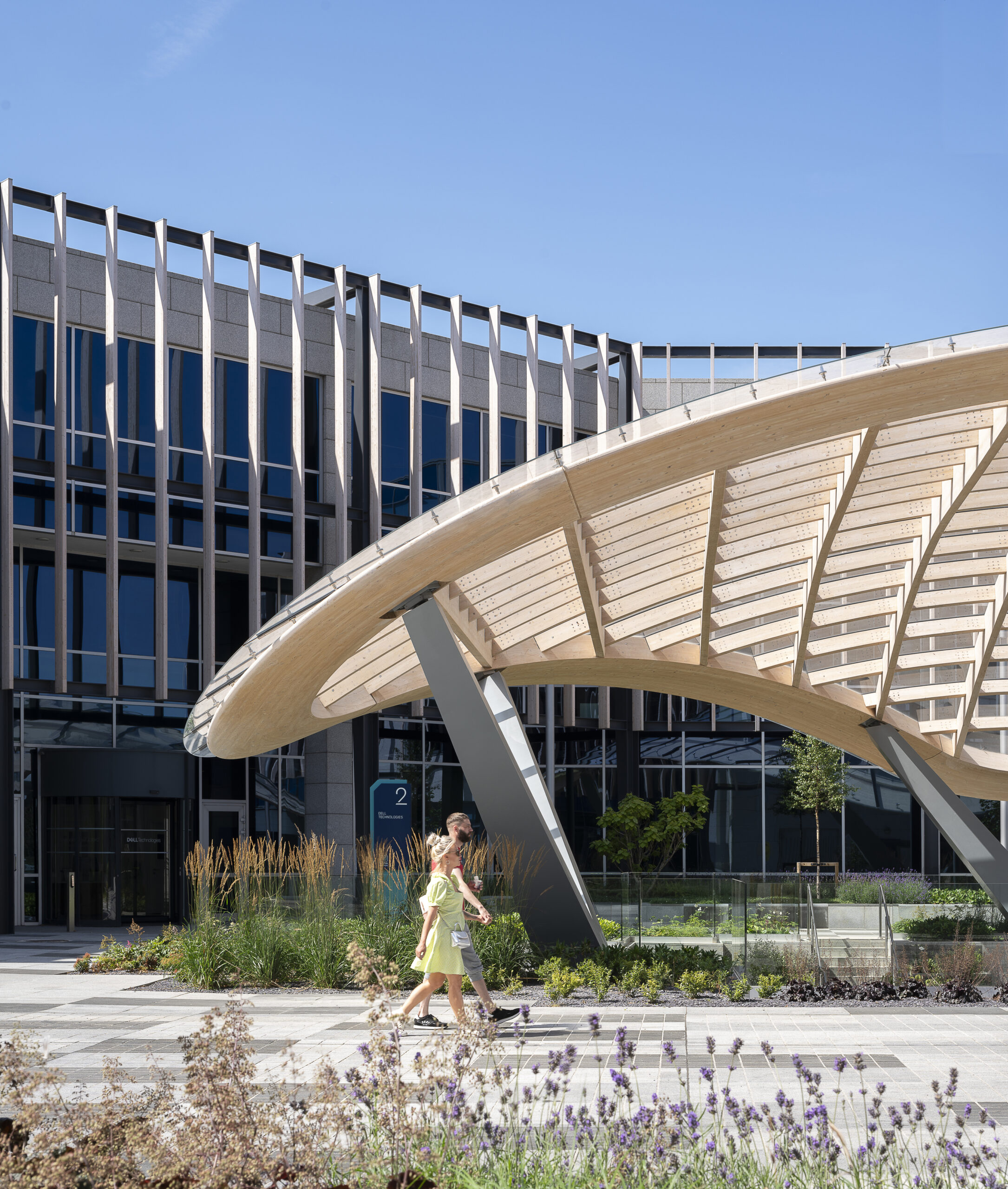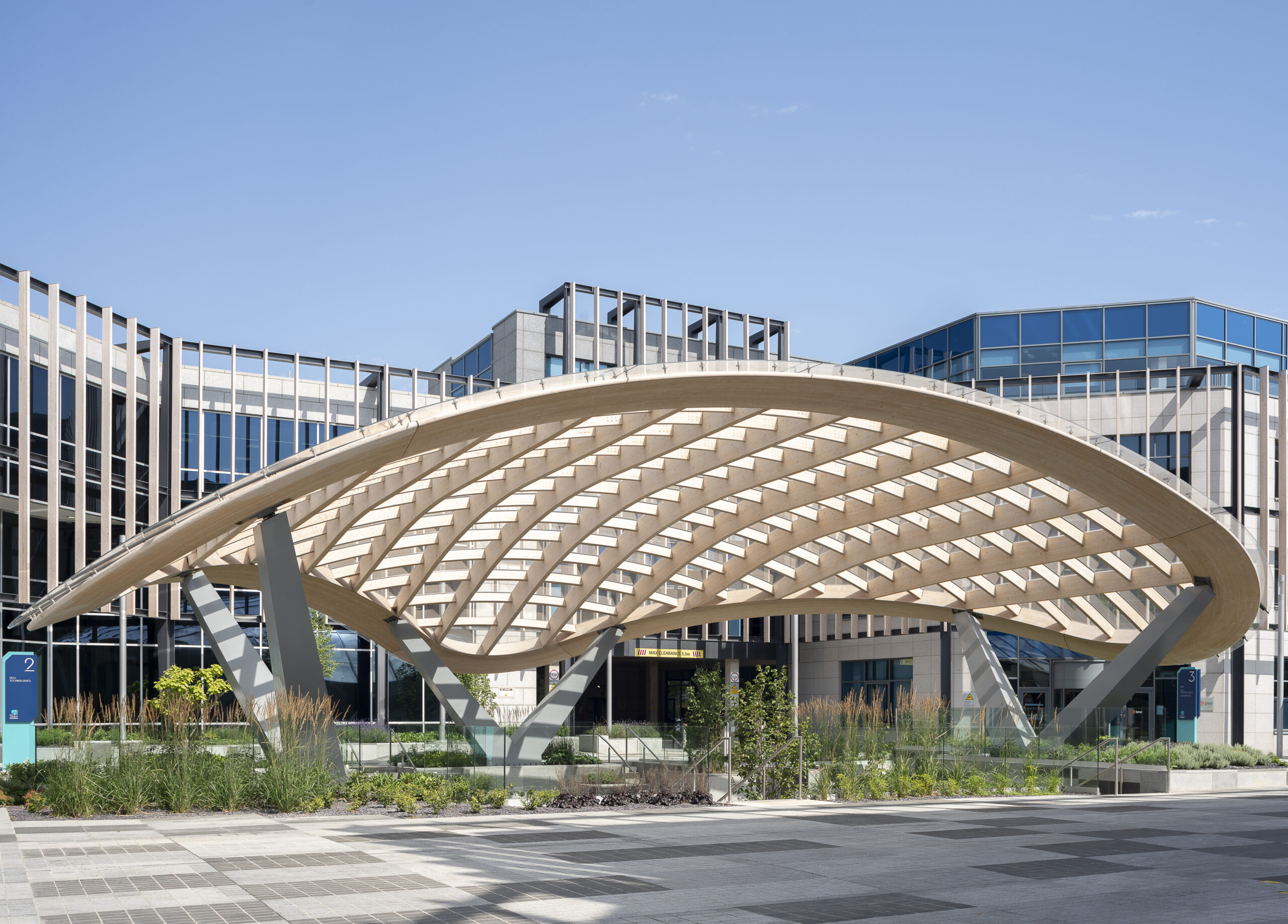 Timber acts as the primary exposed material, demonstrating how low-carbon construction can shape contemporary public realm and support a more sustainable model of workplace development. Together, the canopy and garden enhance wellbeing, social interaction and biodiversity, and contribute to Cherrywood’s ambition to foster a nature-based urban environment grounded in amenity and public life.